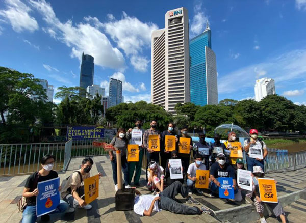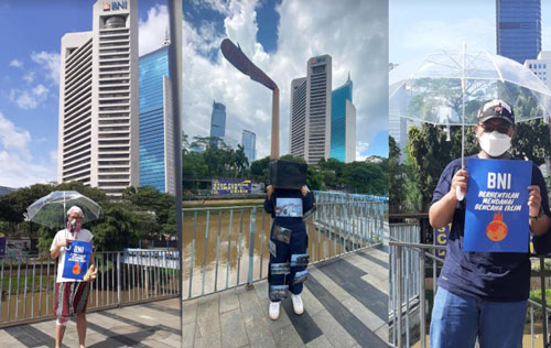 Aksi dilakukan di sekitar gedung BNI Jakarta. BNI menjadi sasaran aksi, karena dinilai menjadi salah satu bank papan atas Indonesia yang masih mendanai batu-bara, penyebab krisis iklim.