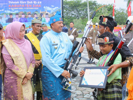 SIAK - Pemerintah Daerah (Pemda) Kabupaten Siak menggelar Upacara Peringatan Hari Jadi Kabupaten Siak ke-23 sekaligus Penyerahan Piagam Penghargaan Bupati Siak, di Halaman Kantor Bupati Siak, Senin (12/10/22).