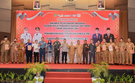 PEKANBARU - Bupati Bengkalis Kasmarni menyerahkan Dokumen Pelaksanaan Anggaran (DPA) Satuan Kerja Perangkat Daerah (SKPD) di lingkungan Pemerintah Kabupaten Bengkalis, Senin (15/1/2024) di Pekanbaru.