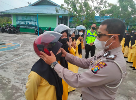 Dalam giat kampanye keselamatan berlalulintas tersebut, juga membagikan helm secara gratis kepada siswa-siswi disana.