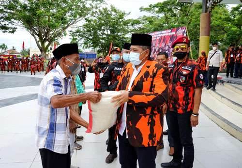 Selanjutnya Alfedri bersama Ketua MPC PP Siak Dedi Kusnedi memberi bantuan sebanyak 580 karung beras dari PP Kabupaten Siak sekaligus melakukan Donor Darah dari Pemuda Pancasila.(**)