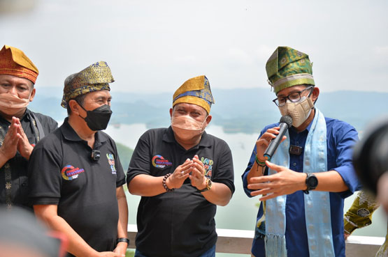 Di tempat wisata yang mirip Raja Empat itu, Sandiaga menikmati pesona Danau Koto Panjang dan gugusan pulau sembari menelusuri sentra parekraf suvenir, pembuatan olahan patin, kriya, dan fesyen batik khas Kampar.